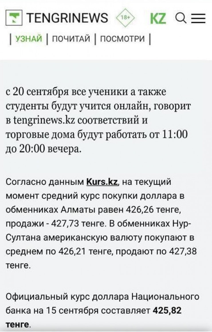 В действительности распространяемый скриншот является результатом обработки в графических редакторах. Шрифт в сообщении о переходе на дистанционный формат обучения отличается от шрифта, используемого на Tengrinews.kz. В оригинальной новости речь идет исключительно об изменениях в курсах валют на 15 сентября 2021 года.