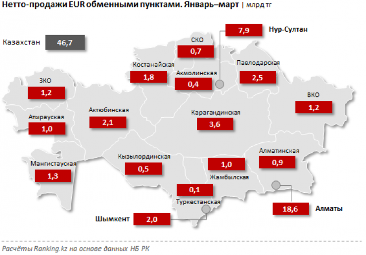 По объему нетто-продаж евро лидирует Алматы: 18,6 миллиарда тенге, это на 55,6 процента меньше, чем в прошлом году. Следом идет Нур-Султан: 7,9 миллиарда тенге, рост за год - 34,9 процента. Замыкает тройку лидеров Карагандинская область: 3,6 миллиарда тенге — на 15 процентов меньше, чем в прошлом году.