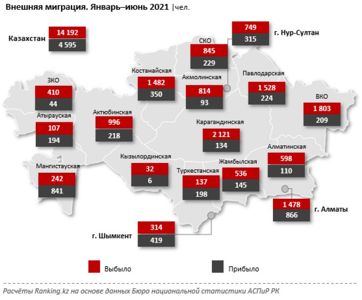 Среди регионов больше всего казахстанцев выбыло из Карагандинской области - 2,1 тысячи человек. В топе также Восточно-Казахстанская и Павлодарская области. По прибывшим лидирует Алматы, за полгода в город приехало 866 человек. В тройку входят также Мангистауская область (841 человек, минус 60,8 процента за год) и Шымкент (419 человек, минус 16,5 процента).