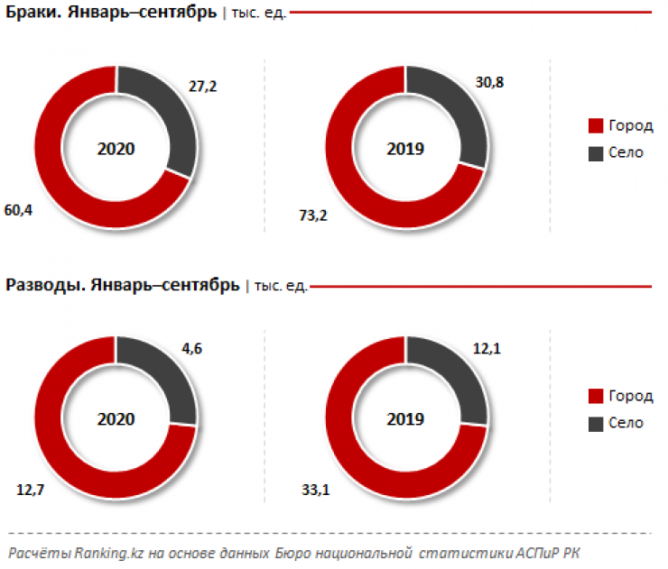 73,4 процента разводов в Казахстане за январь - сентябрь 2020 года пришлось на города - 12,7 тысячи (годом ранее - 73,3 процента), а 26,6 процента - на сельскую местность, 4,6 тысячи. При этом и в городах, и в сельской местности количество разводов сократилось в 2,6 раза за год.