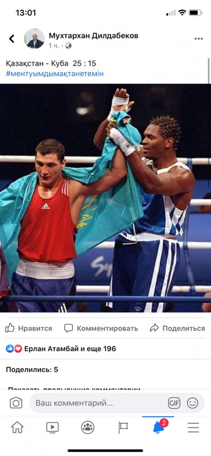 В Facebook фотографию с хештегом #ментуымдымақтанетемін опубликовал казахстанский боксер Мухтархан Дилдабеков.