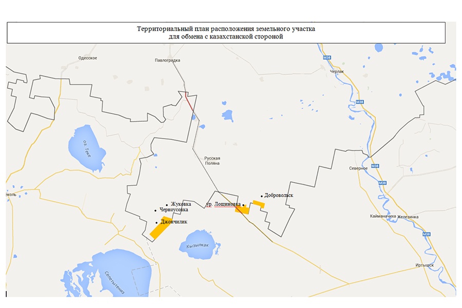 Взамен Омская область готова отдать Казахстану участок, равный по площади и по климатическим условиям. "Соседям предстоит выбрать один из двух вариантов обмена: в первом случае казахстанцам отдадут участок площадью 2427 гектаров, что в 12 километрах южнее села Черноусовка, во втором - 2 участка общей площадью 2402 гектара вблизи урочища Лощиновка", - говорится в статье.