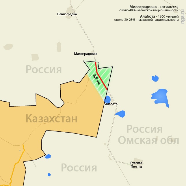 Для наглядности ситуации с обменом обратимся к карте. Судя по ней, казахстанская граница клином "вторгается" на территорию Омской области, между двух сел - Милоградовка (720 жителей, около 40 процентов казахов) и Алабота (1600 жителей, 20-25 процентов казахов). Села соединяет участок дороги Омск - Русская Поляна длиной 9,6 километра, проходящий по землям Казахстана. "На территории казахстанского "клина" (на карте отмечен зеленым. - Прим.) нет сел - в администрациях Павлоградского и Русско-Полянского районов сообщили, что там находятся поля", - сообщает НГС.