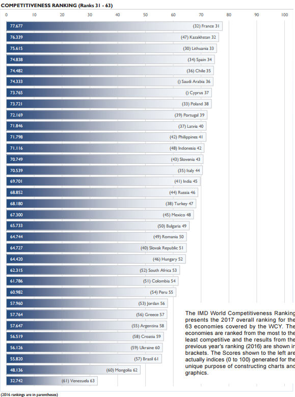 Казахстан резко улучшил свои позиции, поднявшись с 47-го на 32-е место. Наибольший прогресс за минувший год был продемонстрирован по параметру "государственные финансы". В этом компоненте республика переместилась с 51-го места сразу на четвертое. Показатель "внутренняя экономика" поднялся с 51-го места на 40-е. Казахстан также существенно поднялся по всем позициям в категории "эффективность бизнеса".