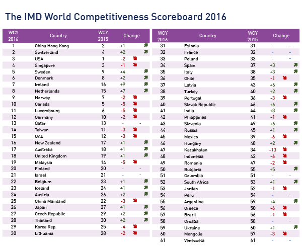 Согласно последнему выпуску мирового рейтинга конкурентоспособности (The World Competiveness Scoreboard-2016), Казахстан показал самое сильное падение - с 34-го на 47-е место.