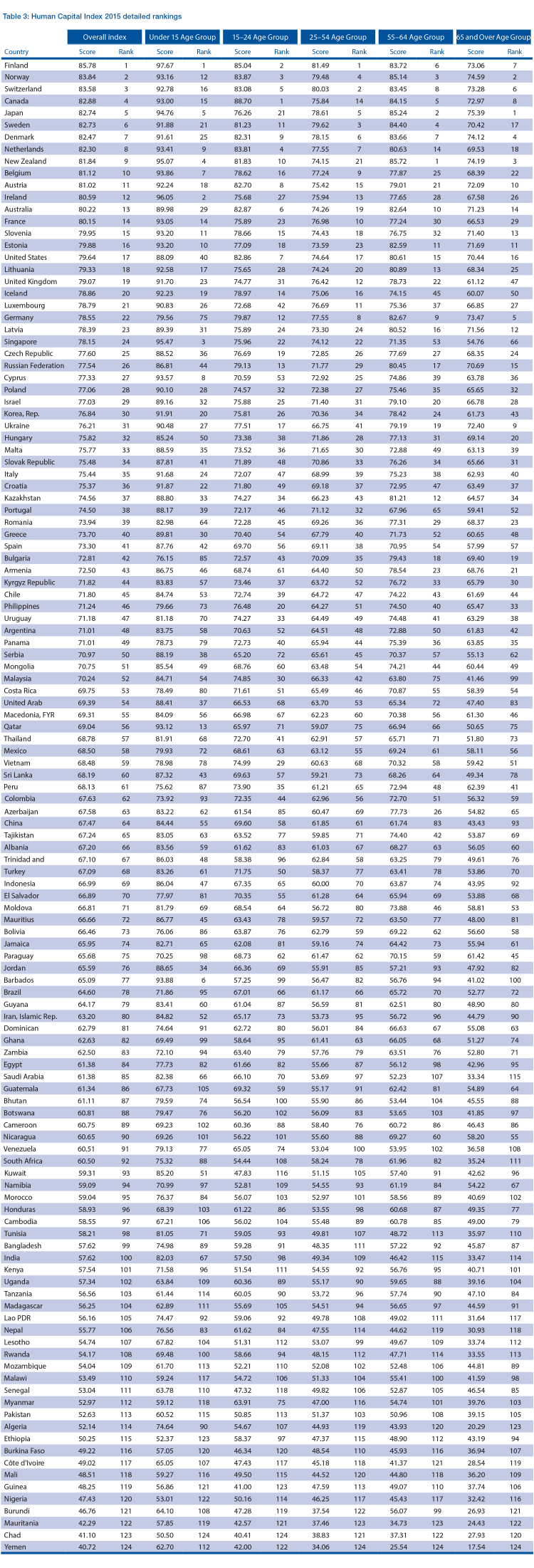 Первое место в мировом рейтинге качества человеческого капитала заняла Финляндия, на втором месте - Норвегия, далее - Швейцария, Канада и Япония. Также в первую десятку вошли Швеция, Дания, Голландия, Новая Зеландия и Бельгия. Кроме того, Франция заняла 14-е место, США - 17-е, Великобритания - 19-е, Германия - 22-е. На последнем месте мирового рейтинга качества человеческого капитала расположен Йемен.