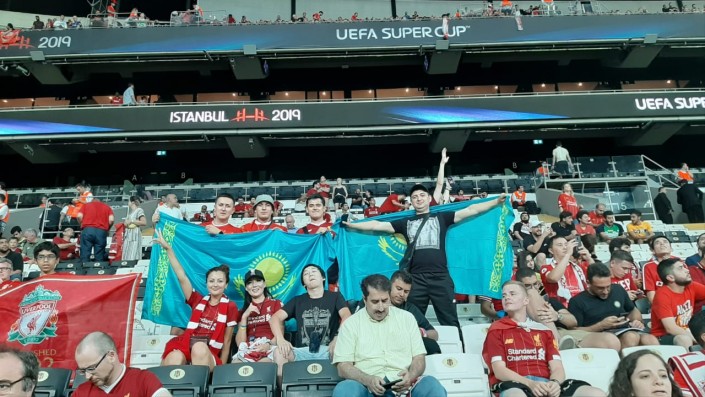 Помимо традиционных флагов "Ливерпуля", казахстанцы привезли и флаги своей страны.