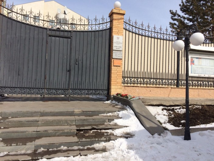 Кроме того, цветы казахстанцы несут к посольству России в Астане.