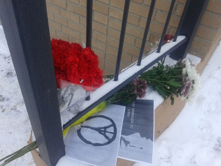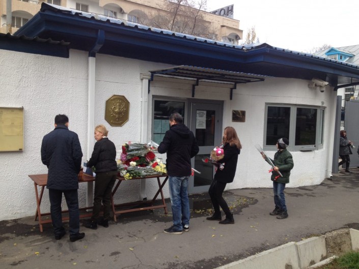 По словам охранника консульства, люди начали приходить с самого утра - примерно с 8.00. Возле двери к зданию был организован специальный стол, на который приходящие могли складывать цветы. Также на нем стояли несколько горящих свечей и "Книга соболезнований". По словам охранника консульства, к обеду выразить свои соболезнования по погибшим во время теракта в Париже пришли более 70 человек.