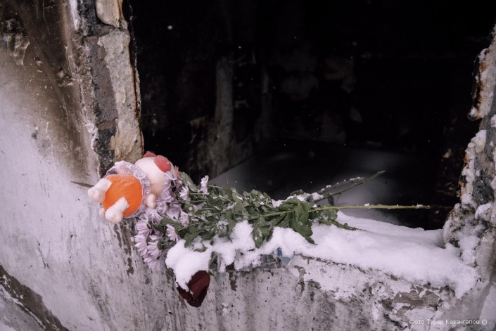 Люди несли цветы и игрушки к месту пожара в микрорайоне Коктал-1.