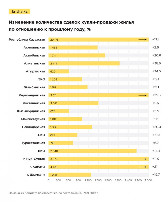 За год (август 2019-го к августу 2018-го) в Казахстане зафиксирован рост сделок купли-продажи жилья на 17,1 процента, передает корреспондент Tengrinews.kz со ссылкой на Krisha.kz.