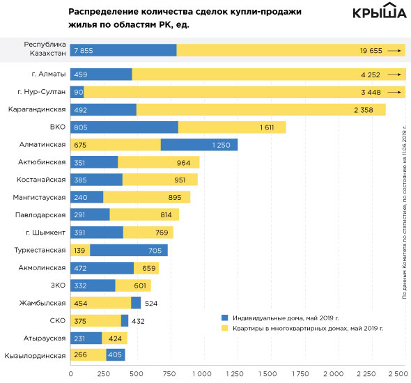 За год, по данным Комитета по статистике (май 2019 года к маю 2018-го), в Алматы количество операций купли-продажи жилья увеличилось на 69,7 процента. При этом в Нур-Султане активность на рынке недвижимости небольшая — прирост составил всего 5,5 процента.