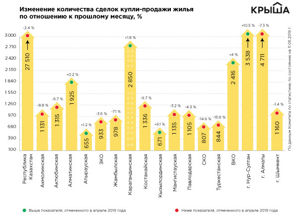В лидерах по росту интереса к жилой недвижимости оказались ЗКО (+31,6 процента за год), Алматинская, Атырауская (+27,8 и +27,7 процента, соответственно) и Актюбинская (+26,4 процента) области. Отрицательных показателей в РК не отмечено. В целом по стране количество сделок выросло на 23,1 процента.