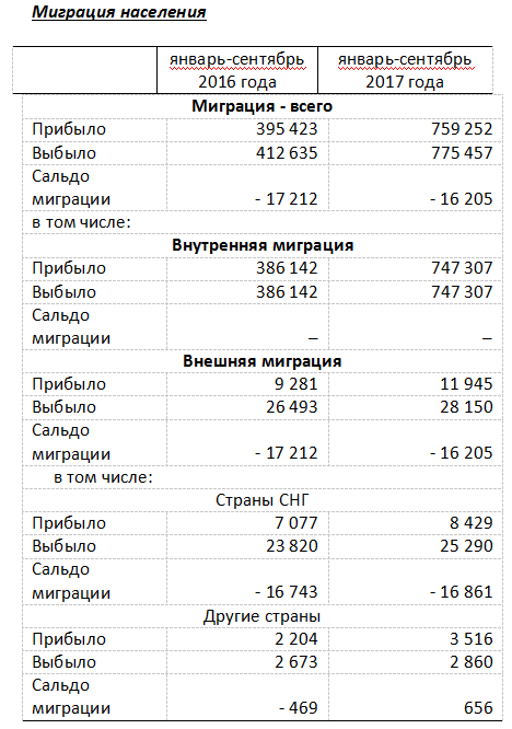 При этом в Казахстане по-прежнему наблюдается отрицательное сальдо миграции. Так, число зарегистрированных прибывших в страну мигрантов в январе-сентябре 2017 года по сравнению с соответствующим периодом 2016 года увеличилось на 28,7 процента и составило 11 945 человек, число выбывших из страны мигрантов увеличилось на 6,3 процента и составило 28 150 человек, сальдо миграции -16 205 человек.