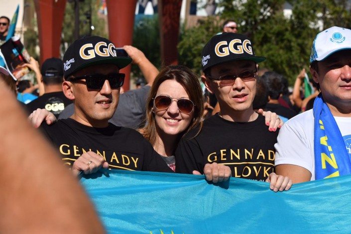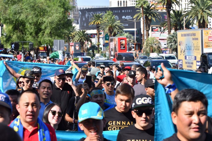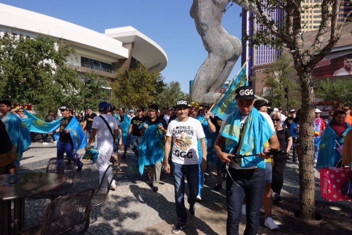 Казахстанцы организовали шествие по Лас-Вегасу в поддержку чемпиона мира по версиям WBA (Super), WBC, IBF и IBO в среднем весе Геннадия Головкина перед боем с мексиканцем Саулем "Канело" Альваресом, сообщают Vesti.kz.