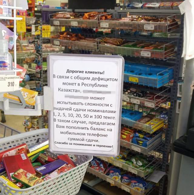 Объявления о нехватке монет появляются в торговых домах Алматы. Администраторы говорят о нехватке монет номиналом от 1 до 100 тенге и просят покупателей расплачиваться банковскими картами.