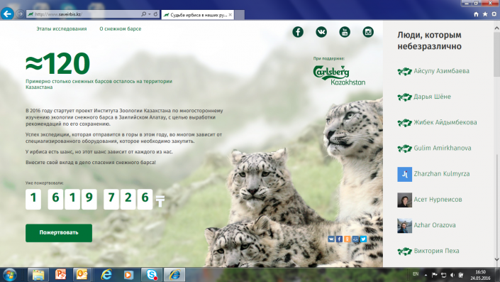 "Через этот сайт счет Института зоологии может пополняться всеми неравнодушными лицами, желающими внести свой вклад в работу по сохранению отечественной популяции снежного барса. Первая крупная сумма в 1,5 миллиона тенге уже была перечислена от нас. Для того, чтобы отчетность по проекту была максимально прозрачной, на портале будет регулярно размещаться информация о собранных и потраченных в рамках проекта средствах. Также пользователи портала смогут следить за новостями проекта и первыми увидеть размещаемые здесь уникальные фото и видео, сделанные учеными в ходе полевых экспедиций", - рассказали в компании Carlsberg Kazakhstan.