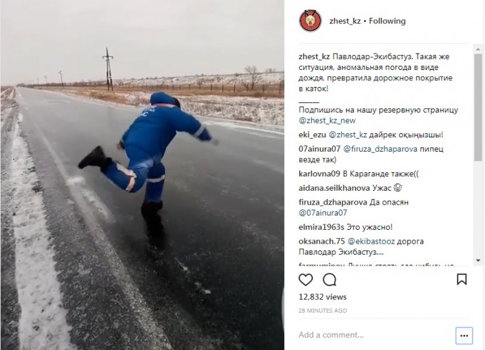 "КамАЗы стоят, не могут заехать (из-за гололеда) на новый мост между Аксу и Павлодаром", - написали в паблике sarafan.com.kz.