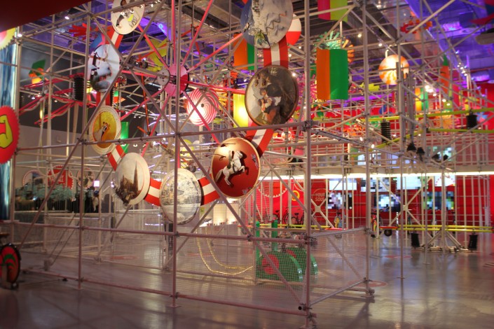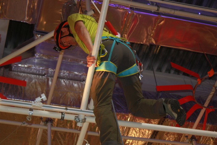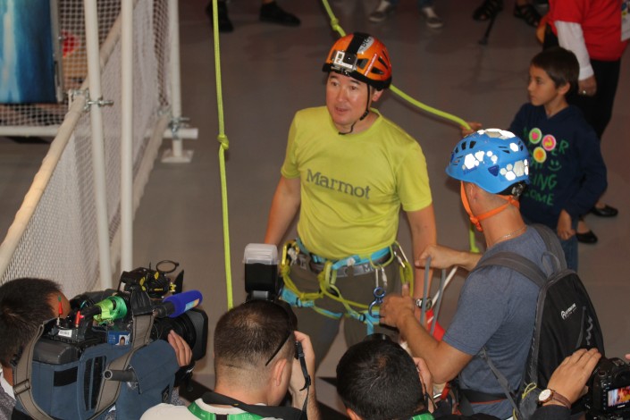 При помощи специальной экипировки спортсмен совершил восхождение на конструкцию из атрракционов и механизмов под названием "Силовая машина". Забравшись на самую высокую точку конструкции, Максут Жумаев закрепил на импровизированной вершине флаги Казахстана и Австрии.