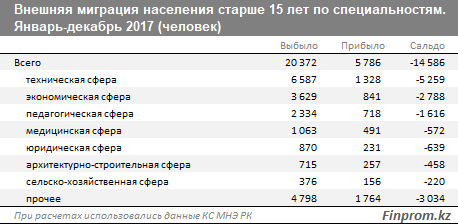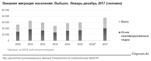 Наиболее критичен отток технарей, экономистов и педагогов. В целом за 2017 год страну покинули 37,7 тысячи человек. Это на 25,3 процента больше, чем в 2015 году*, когда страну покинули 30,1 тысячи человек. Преимущественно казахстанцы уезжали в страны СНГ - 33,7 тысячи, в другие страны выбыло четыре тысячи человек.