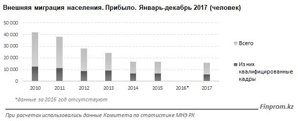 Квалифицированных кадров в 2017 году прибыло всего 5,8 тысячи человек, что на 15 процентов меньше, чем в 2015-м. Их доля от общего количества прибывших в РК составила 36 процентов, в 2015 году - 40,9 процента.
