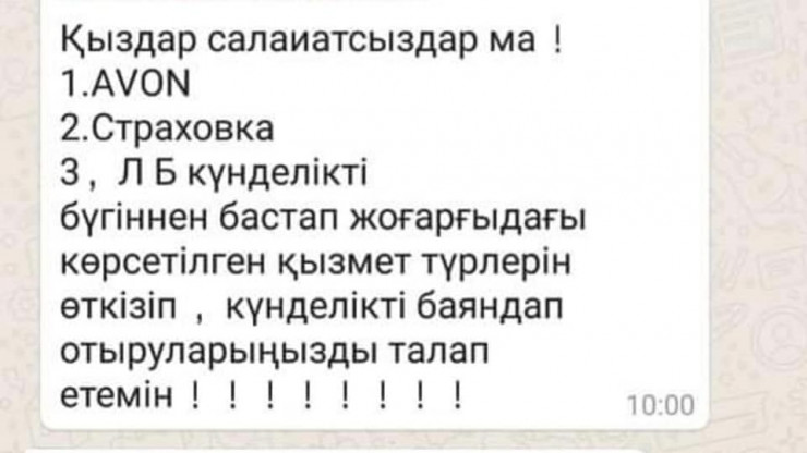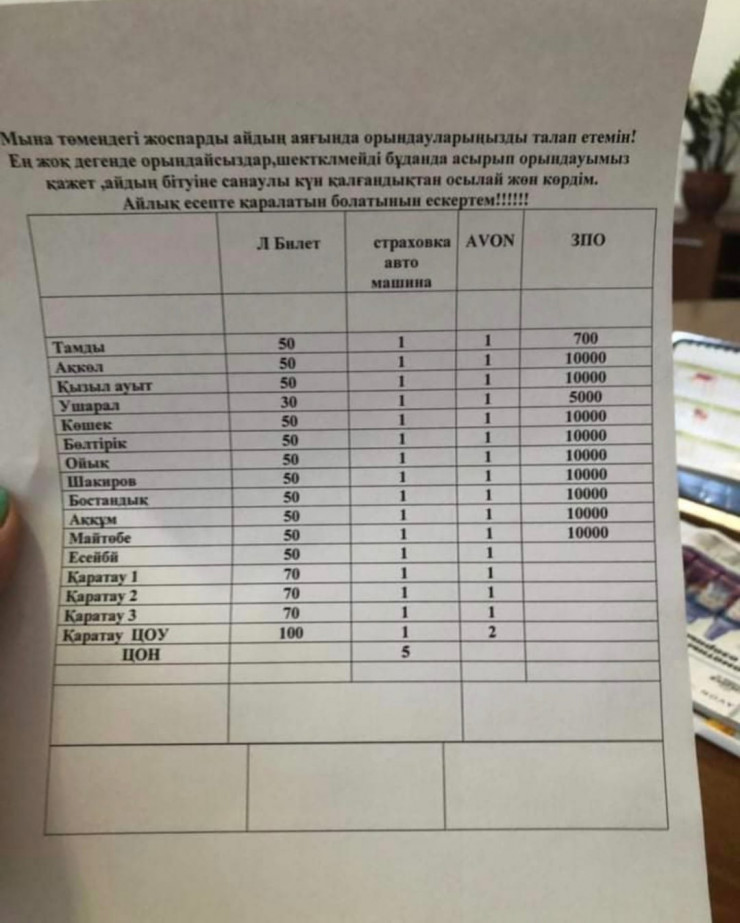 "Мына жоспарды айдың аяғында орындауларыңызды талап етемін. Шектелмейді, бұдан да асырып орындауымыз қажет. Айдың бітуіне санаулы күн қалғандықтан, осылай жөн көрдім. Айлық есепте қаралатынын ескертемін", - деп жазылған хабарламада.