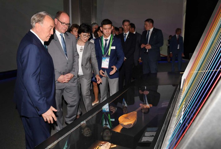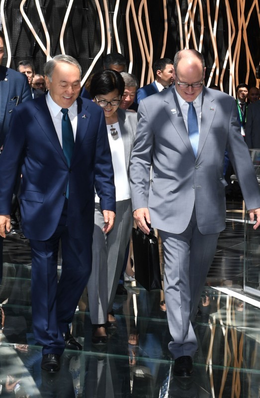 В завершение посещения павильона княжества Нурсултан Назарбаев оставил запись в книге почетных гостей и показал Альберу II национальный павильон Казахстана "Нур Алем". Здесь лидеры двух стран ознакомились с методом подземного скважинного выщелачивания урана, интерактивным макетом термоядерного реактора "Токамак" и другими экспозициями, посвященными культуре и истории Казахстана.
