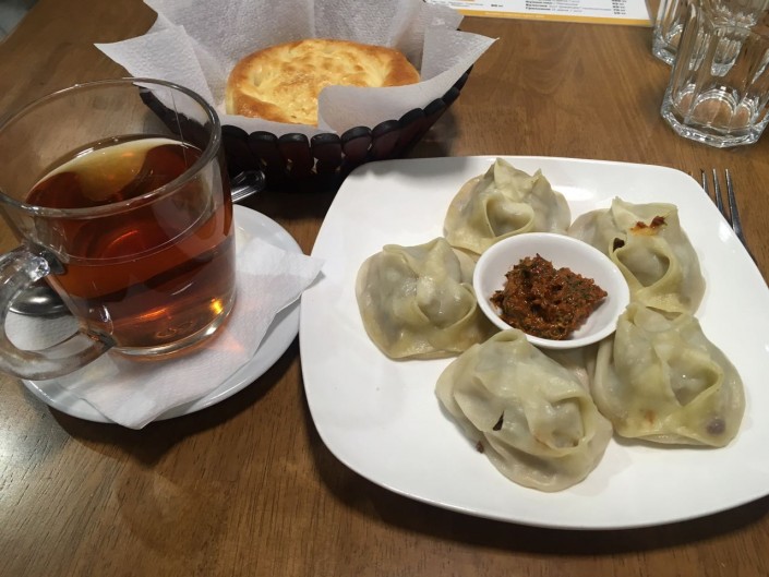 Так выглядит обед с кодовым словом "Я от Байбека". Это манты, лепешка и кружка черного чая.