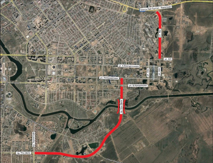 Также ведем строительство улицы А62 (на участке от улицы А91 до трассы Нур-Султан-Караганда). Данная улица позволит обеспечить транспортное сообщение между Карагандинской трассой и железнодорожным вокзалом "Нурлы Жол" и левобережной частью города. Здесь планируем обеспечить проезд уже осенью текущего года. Тем самым данная улица также позволит соединить районы с новым мостом.