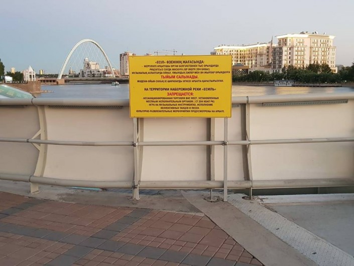 Большая табличка появилась на ограждении вдоль набережной реки Есиль. Вывеска предупреждает, что на территории набережной реки Есиль запрещены несанкционированная торговля, а также "игра на музыкальных инструментах и исполнение коллективных танцев и песен".