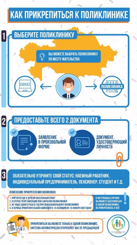 Сералиева отметила, что если человек уже прикреплен и знает свою поликлинику, то заново прикрепляться ему не надо. В случае если прикрепления к поликлинике нет, то можно сделать это, посетив медучреждение лично или через портал egov по месту жительства. Следует подать запрос в форме электронного документа с указанием данных гражданина. В поликлинике ответственный работник получает электронный запрос из соответствующих информационных систем и оформляет талон о прикреплении также в электронном виде.