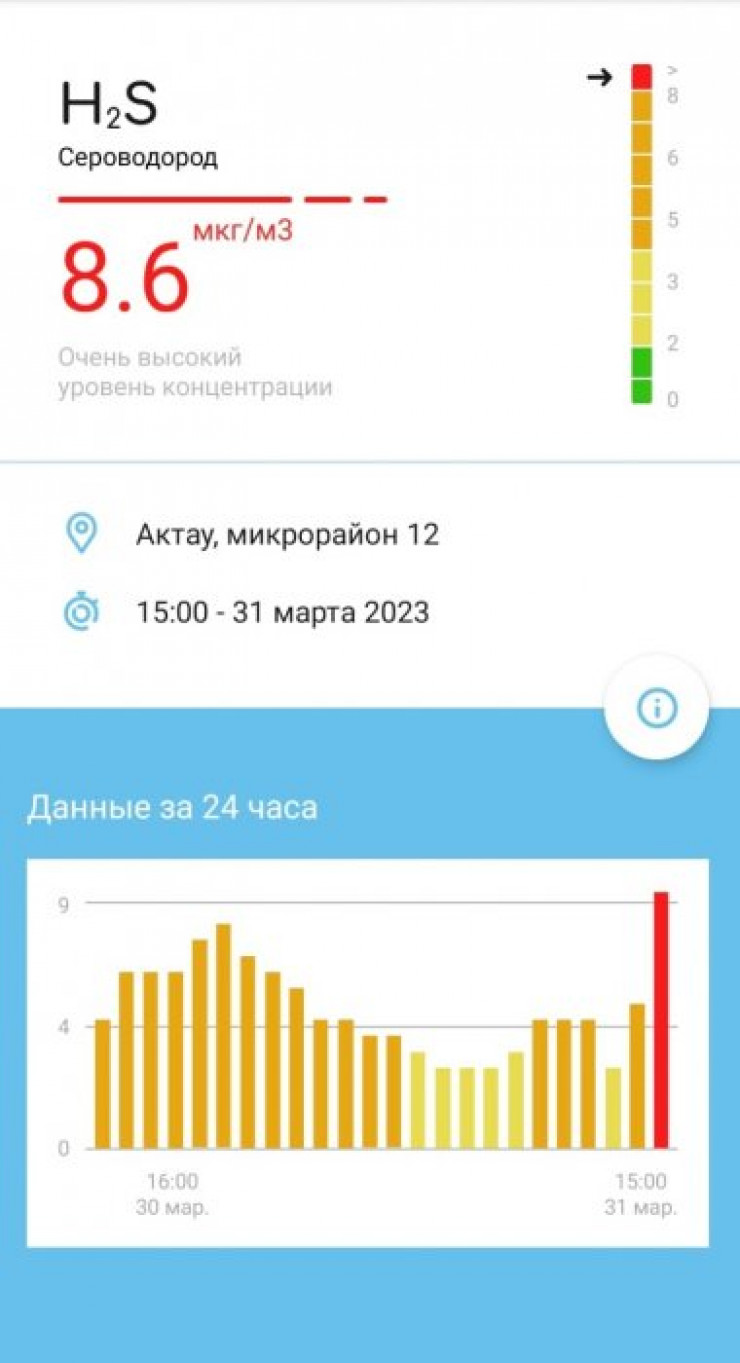 По данным другого ресурса iqair.com, концентрация PM2.5 в Актау сейчас в 4,7 раза выше рекомендуемого ВОЗ среднегодового значения качества воздуха. А в соцсетях жители делятся данными с мобильного приложения Airkaz, сделанными в разное время.