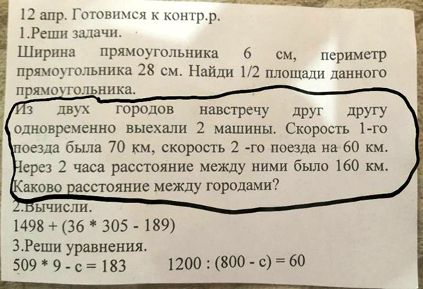 Шеваловский заявил, что такое задание дали ученикам в школе №16. "Выехали машины, приехали поезда:). Скорость у одного из них на 60?) Я понимаю, что ответ будет 560 километров. Вопрос в другом. Как объяснить ребенку, что не надо верить написанному? Вот тут опечатка, во втором предложении недописка, а это домысливание? И если бы это был единичный случай. Это очень частое явление. Кто правильно решит задачу - будет гуру в математике. Машины - поезда-трансформеры. Вот у нас не было карточек, учились по учебникам. Теперь всякую ерунду печатают и школьникам мозги пудрят", - написал он.
