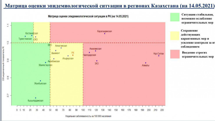 Согласно матрице оценки эпидемиологической ситуации в регионах Казахстана на 14 мая, в "красной" зоне находятся Нур-Султан, Алматы, Акмолинская, Западно-Казахстанская, Карагандинская и Павлодарская области.