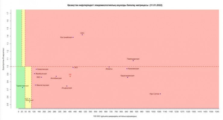 - в "красной" зоне находятся Нур-Султан, Алматы, Атырауская, Алматинская, Акмолинская, Актюбинская, Восточно-Казахстанская, Западно-Казахстанская, Жамбылская, Мангистауская, Карагандинская, Костанайская, Павлодарская, Северо-Казахстанская области;