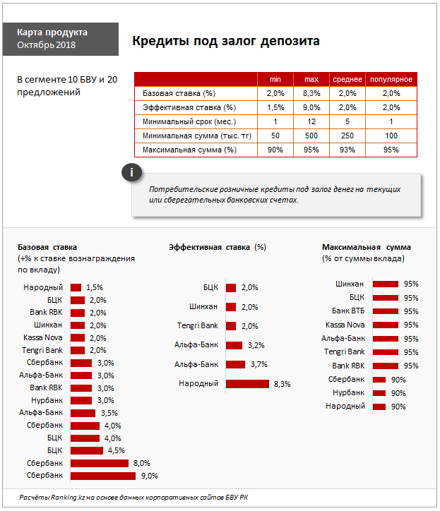 Розничные кредиты под залог депозита предлагают 10 БВУ РК. Минимальная ставка по кредиту варьируется от 1,5 процента (Народный банк) до 9 процентов (Сбербанк) маржи к ставке депозита.