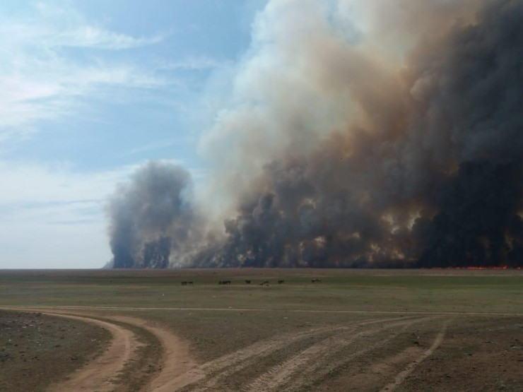 В социальных сетях пользователи делятся роликами, в которых запечатлен крупный пожар в степи Актюбинской области.