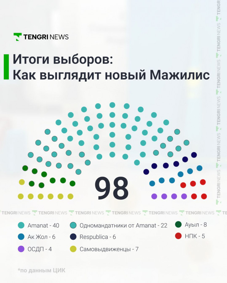 По итогам голосования в Мажилис прошли шесть из семи участвовавших в выборах партий. Партия Amanat получила 40 мандатов, "Ауыл" - 8 мандатов, по 6 мандатов у Respublica и "Ақ жол", 5 мандатов у НПК и 4 мандата у ОСДП.