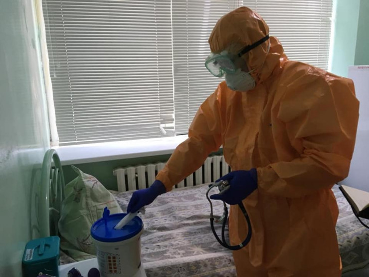 На фотографиях видны защитные костюмы, в которых работают санврачи.