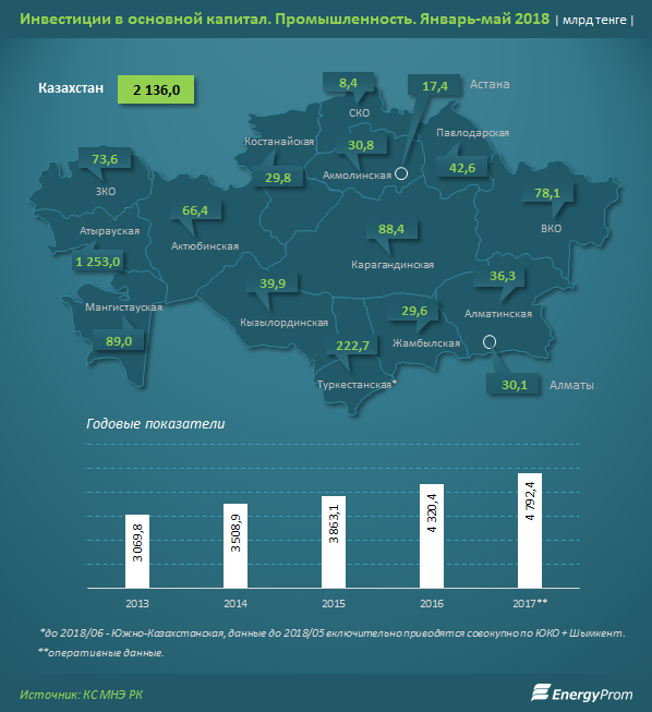 Инвестиции в промышленный сектор выросли за год сразу на 44,2 процента, до 2,1 триллиона тенге с начала 2018 года. Объемы инвестиций в сферу нефтедобычи выросли на 68,1 процента, передает Tengrinews.kz со ссылкой на мониторинговое агентство Energyprom.kz