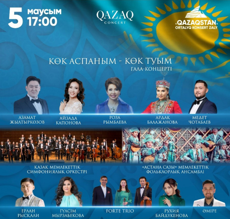 В Центральном концертном зале QAZAQSTAN пройдет гала-концерт, посвященный 30-летию Государственных символов Республики Казахстан. Зрителей ждет разножанровая программа, на сцене выступят артисты классической, фольклорной, эстрадной музыки и театра мюзикла: Роза Рымбаева, Ерлан Рысқали, Азамат Жылтыркөзов, Медет Чотабаев, Ардақ Балажанова, Айзада Капонова, Гүлсім Мырзабекова, Күнсұлу Түрікпен, Асқар Мұқият, Әміре, Әлібек Альмадиев, Рухия Байдүкенова, Азат Мәлік, Салтанат Меңдіғалиева, Біржан Айтахметов, Дидар Әбдухалық, Әйгерім Алтынбек, дуэт T&Y.