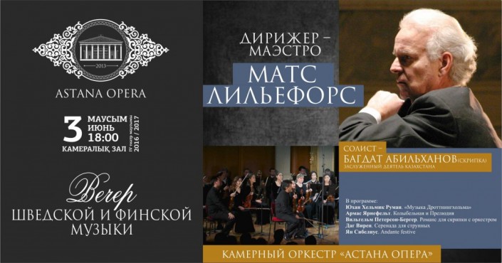 В концерте при участии камерного оркестра "Астана Опера" прозвучат произведения шведских композиторов позднего барокко, классиков финской композиторской школы, а также сочинения казахстанских авторов.
