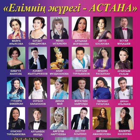 В концертном зале "Астана" (бывший Конгресс-Холл) состоится эстрадный концерт патриотической песни "Елімнің жүрегі – Астана", на сцене выступят Майра Ильясова, Багдат Самединова, Алтынай Жорабаева, Естай Мукашев, Женис Искакова, ансамбль народного танца "Шалкыма" и другие.
