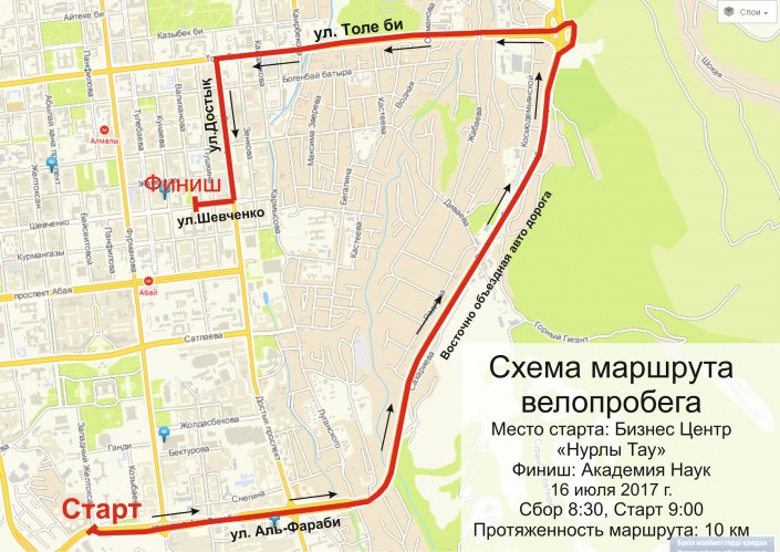 Любители активного отдыха в этот раз проедут 10 км. Сбор по традиции начинается в 08:30 часов на территории БЦ "Нурлы Тау". Там участники получат стартовые номерки от организаторов для розыгрыша ценных призов в лотерее и стартует в 9:00 часов.