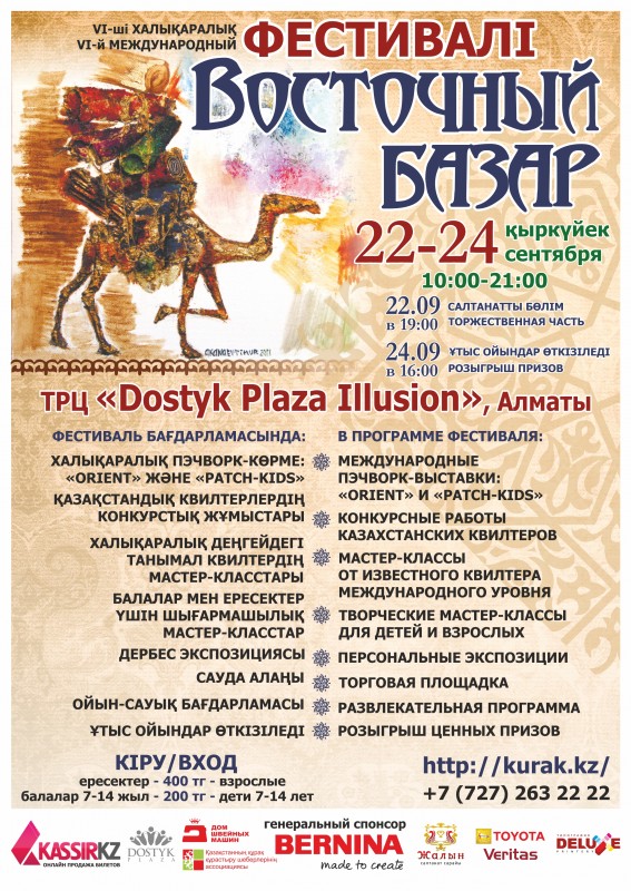 В Dostyk Plaza Illusion состоится фестиваль "Восточный базар". Гостей ждет много интересного и познавательного: международная путешествующая выставка Orient, детская международная выставка Patch-Kids, ярмарка hand-maderoff, торговая площадка. На фестивале будут представлены работы иностранных и казахстанских мастеров в технике квилтинг и пэчворк. Также будет продемонстрирован швейный перфоманс "От иголки до суперкомпьютера". Главная цель фестиваля - познакомить широкую публику с международными работами и вдохновить казахстанских мастеров на создание новых шедевров.