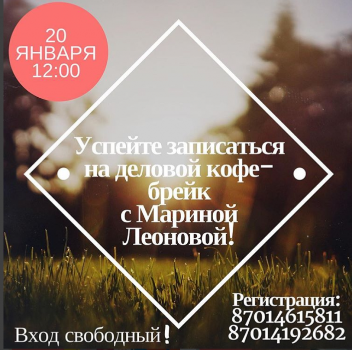 Психолог и тренер по личностному росту Марина Леонова приглашает жителей и гостей Астаны на бесплатный деловой кофе-брейк в отель Come INN Bistro & Hotel. На встрече гости смогут узнать обо всех трансформационных играх, как они воздействуют и работают, получат возможность поиграть в несколько трансформационных игр и почувствовать их благотворное воздействие, а также смогут задать вопросы психологам и тренерам.