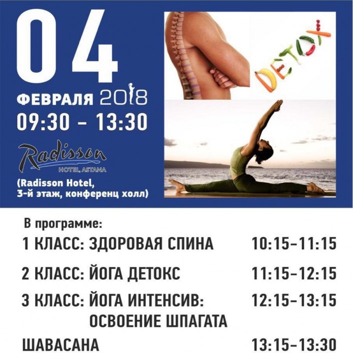 Лучшие мастера йоги Астаны вместе с посольством Индии в Казахстане проведут трехчасовое бесплатное занятие йогой для всех желающих! В просторном конференц-холле отеля Radisson пройдут три класса занятий: упражнения на позвоночник, очищающие организм асаны йоги-детокс, а также интенсив - освоение шпагата. Организаторы советуют одеваться в легкую удобную одежду и принести с собой коврик для йоги.