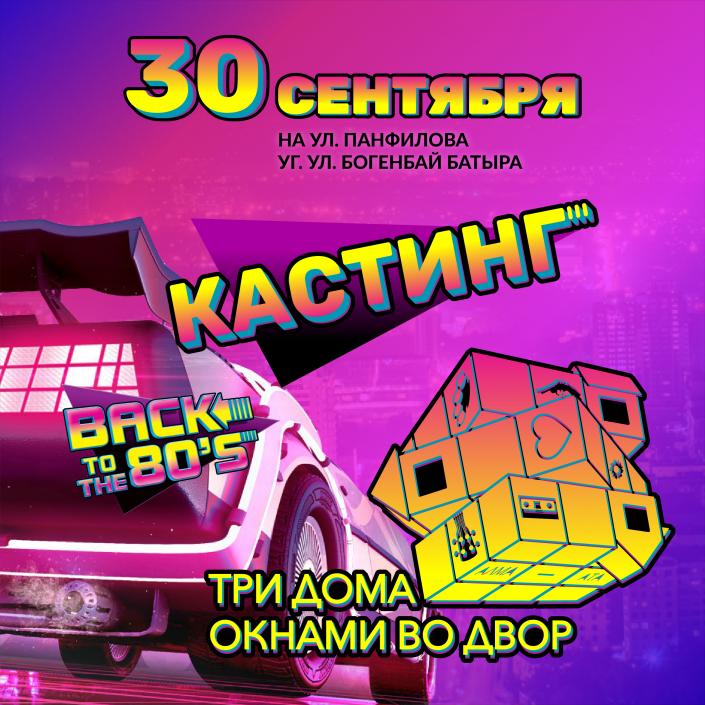 Алматицев и гостей города ждет грандиозное шоу на улице Панфилова (выше улицы Богенбай батыра) около станции "Алмалы", на котором будут все организаторы проекта рок-мюзикла "Три дома окнами во двор"! Участники смогут пройти отбор на проект с агентством "OPS КАСТИНГ" прямо на сцене и получить возможность услышать заветные "вы проходите в следующий тур" или попасть в их базу.