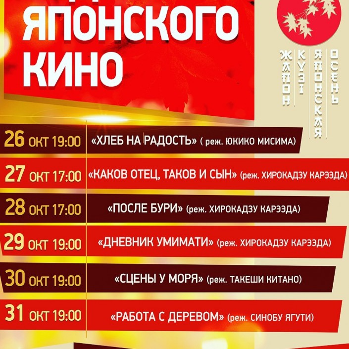 Нынешний фестиваль откроет Неделя японских фильмов. В кинотеатре "Цезарь" покажут картины известных японских кинорежиссеров, в том числе Юкико Мисимы и Такеши Китано.