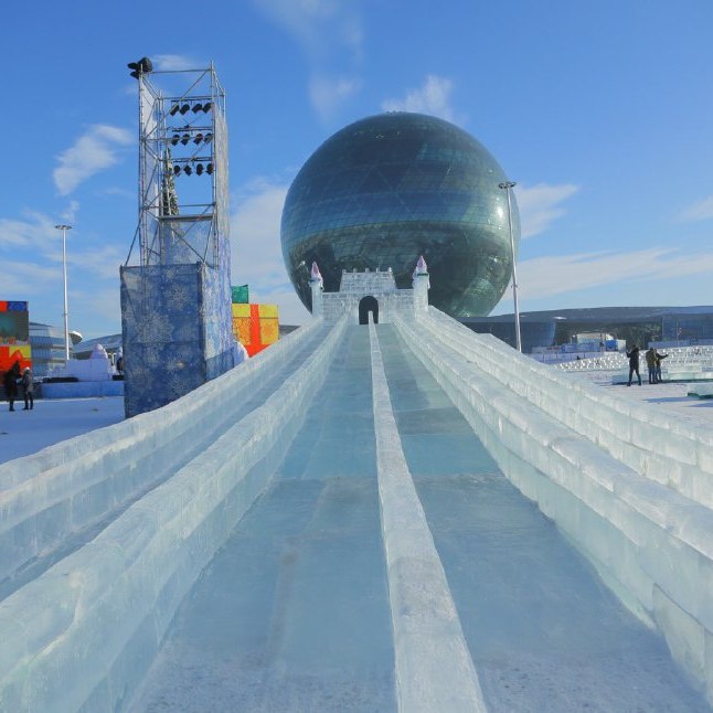 Самая большая снежная горка расположена на площади у монумента "Қазақ Елі". Длина ската составляет более 160 метров.